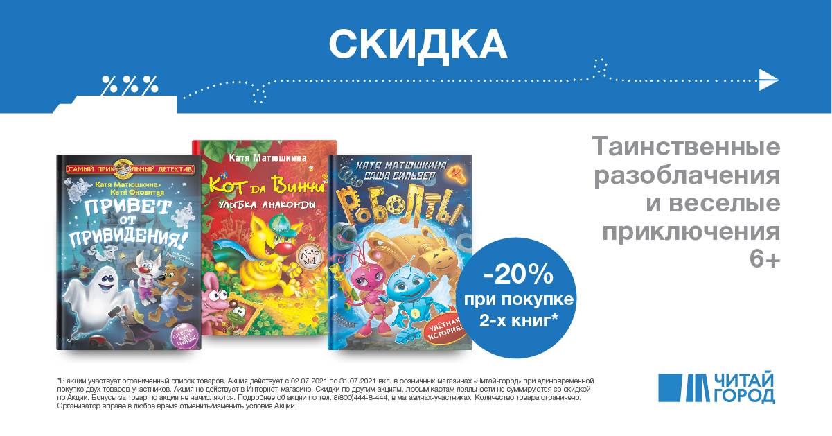 Хотите попасть в волшебный мир фей, Влипсиков и котов-сыщиков? Ваш билет – книги детской писательницы Екатерины Матюшкиной. Приходите в «Читай-город» и выбирайте удивительные истории и отправляйтесь за приключениями вместе с ребёнком :)